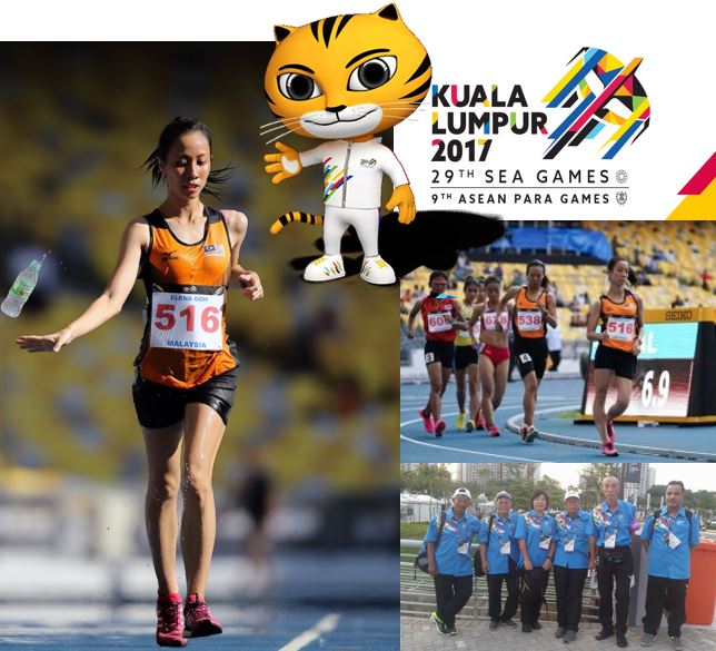 | A vencedora Elena Goh, o início da prova e os juízes de marcha. Fotos: LOC, Sports247 e fb Echo Yeung. Montagem: O Marchador |